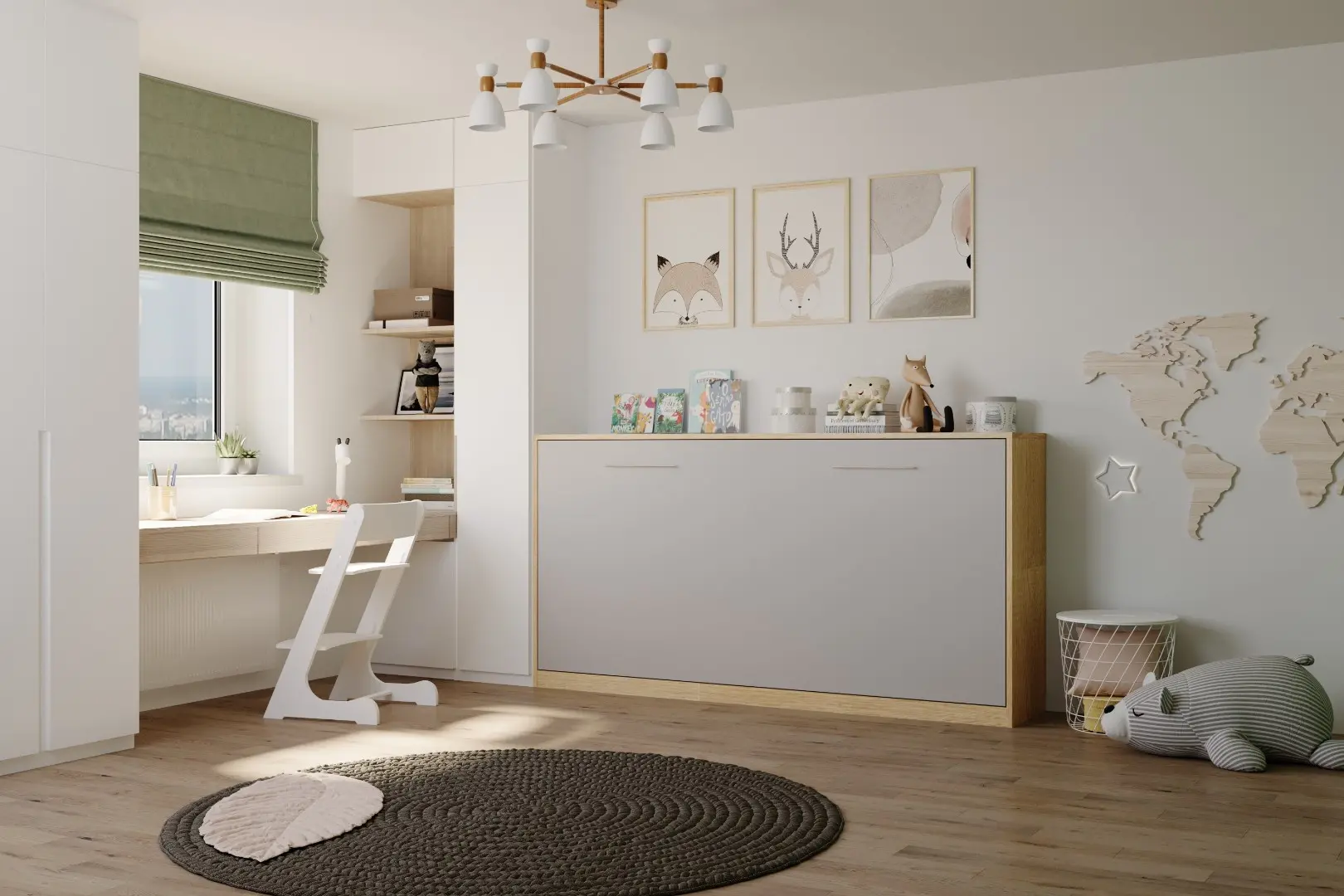 Детская горизонтальная шкаф-кровать "Little sleeper".  Работает на механизме раскладывания собственной разработки "Start". Кровать раскладывается легким движением руки, превращаясь в полноценное спальное место. Просто потяните ее за ручки, расположенные на фасаде и выставите ножки-опоры.